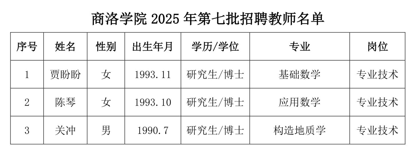 根据陕西省人社厅《陕西省事业单位公开招聘人员办法》《商洛学院人才招聘与管理工作实施办法》(商院〔2023〕9号)及《商洛学院2025年人才招聘公告》,经过资格审查、笔试、试讲、面试、体检、考察等环节,拟招聘贾盼盼、陈琴、关冲同志,现予公示。