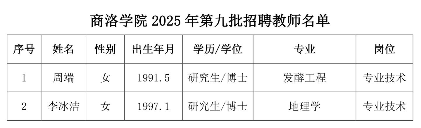 根据陕西省人社厅《陕西省事业单位公开招聘人员办法》《商洛学院人才招聘与管理工作实施办法》(商院〔2023〕9号)及《商洛学院2025年人才招聘公告》,经过资格审查、笔试、试讲、面试、体检、考察等环节,拟招聘周端、李冰洁同志,现予公示。